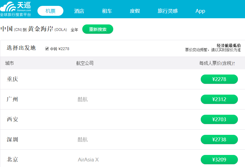 【中国——黄金海岸】含税往返2278元起,搜索日期2018/07/25!