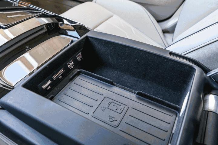 造型方正的排档头设计充满质感。掀开档把旁的饰盖下方则有二具杯架空间及点烟器座。后方扶手翻起后,里面不只有平整的置物空间,也有无线手机充电座的设计,非常人性化。